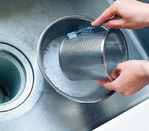 ヌメヌメした排水口には、重曹20gとクエン酸10gをふりかけ、ぬるま湯300㎖ を注ぐだけ。シュワシュワした泡が落ちにくいヌメリを一掃。排水かごのかすは古歯ブラシでこすりましょう。