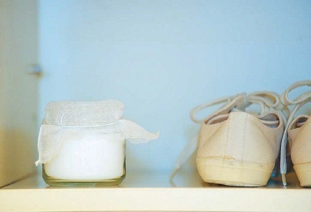 脱臭効果のある重曹を空きビンに入れ、ティッシュでふたをすれば、げた箱内の消臭剤代わりに。臭いを吸着した重曹がかたまりになったら、それを捨て、新たに重曹をたすだけ。