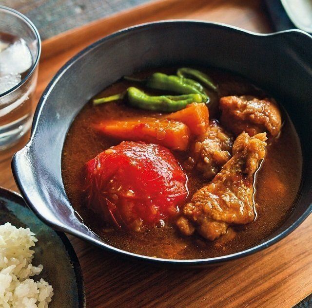玉ねぎがしんなりとしたら、にんじん、水800ml、Aを加えて混ぜ、弱めの中火で20分ほど煮る。カレールウを溶き、トマト、しし唐辛子を加えて弱火で5~6分煮る。器に盛ってご飯を添える。