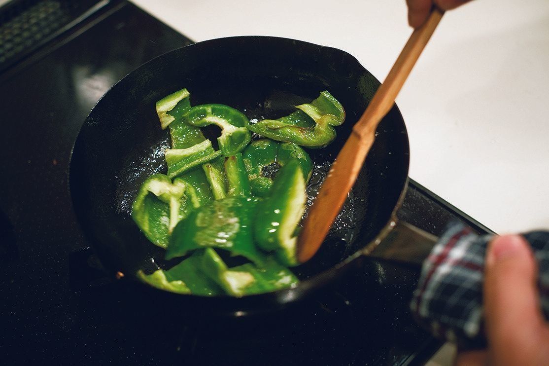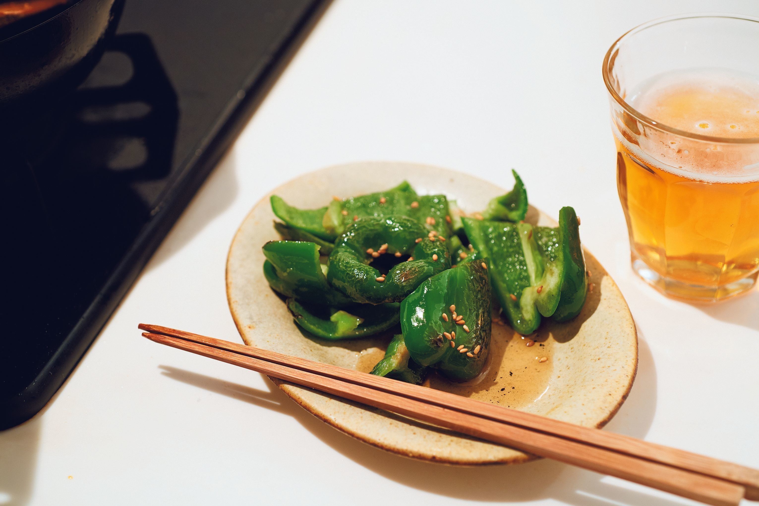 ピーマンは、その香りとポリポリした歯応えが好きですね。たいていごま油でさっと炒めて、塩かエシャロットを漬けた自家製のしょうゆで味つけし、白ごまをパラリとふっただけでいただきます。すぐにできるし、間違いなくビールが進みますよ。