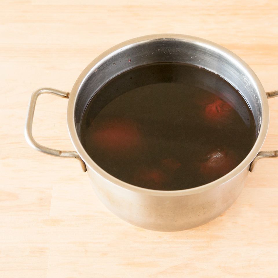 2.鍋にビーツを入れ、かぶるくらいの水、塩小さじ1/2を加えてふたをし、火にかける。沸騰したら弱火にし、40〜60分ゆでる。竹串をさしてみてすっと通ればOK。ゆで汁の中でそのまま、冷ます。