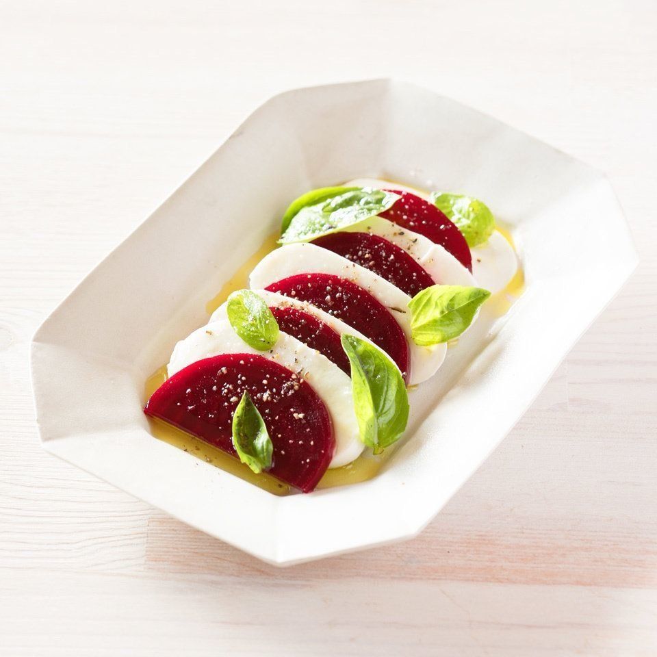 1.ビーツは皮をむいて縦半分に切り、厚さ3mmの半月切りにする。モッツァレラチーズは厚さ4〜5mmに切る。