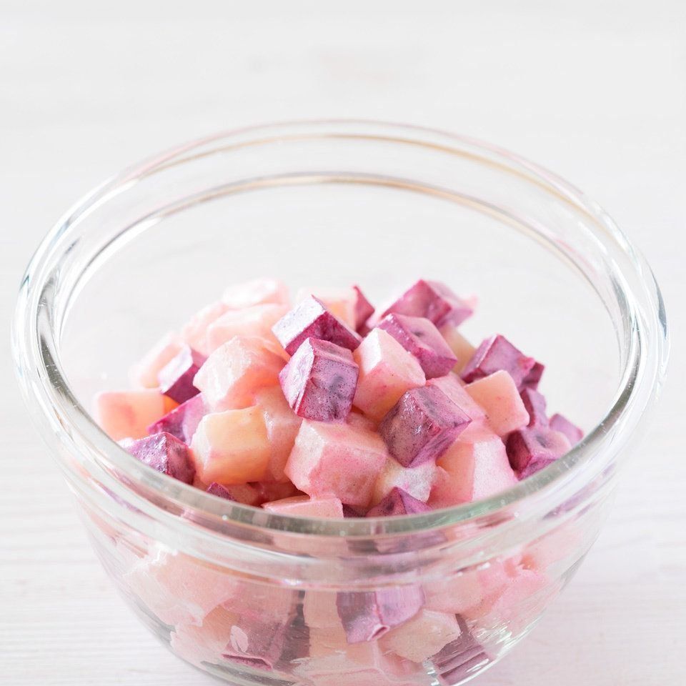 サラダに入れるとおいしいと言いましたが、ゆでたビーツのもうひとつの食べ方ということで、今回はじゃがいもと合わせてサラダにしてみましたよ。ビーツの色がポテトにうつってピンク色になり、かわいいサラダになります。ゆでたビーツを使ってくださいね。