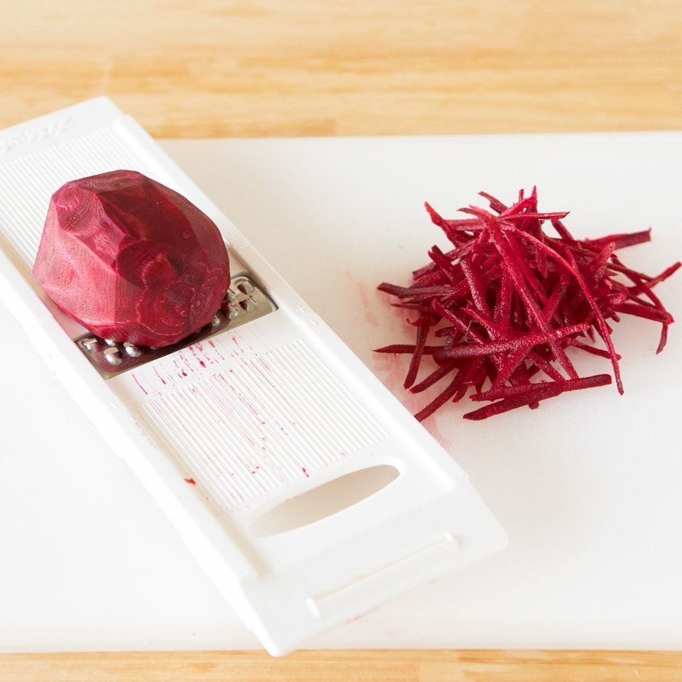 今回は、キャロットラペみたいなせん切りサラダにしようと思うので、せん切りスライサーでザクザクせん切りにしていきます。ビーツは硬いから、力を入れるあまり、手まで切らないように気をつけてくださいね。