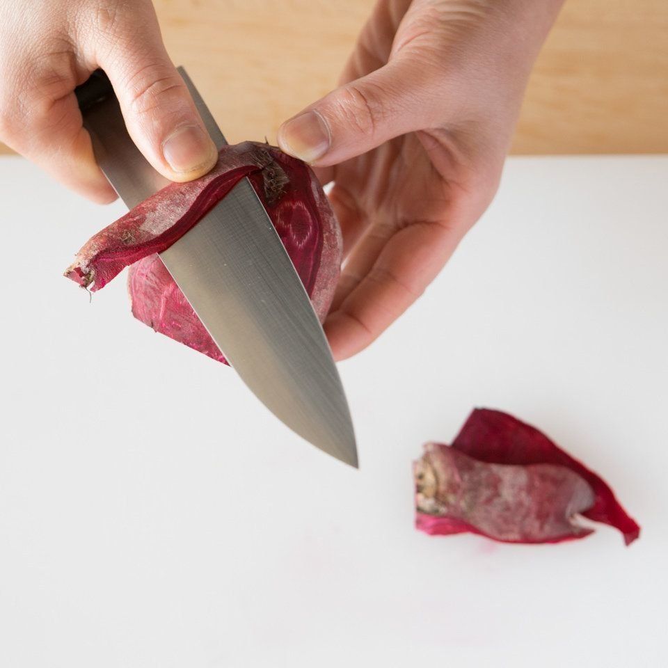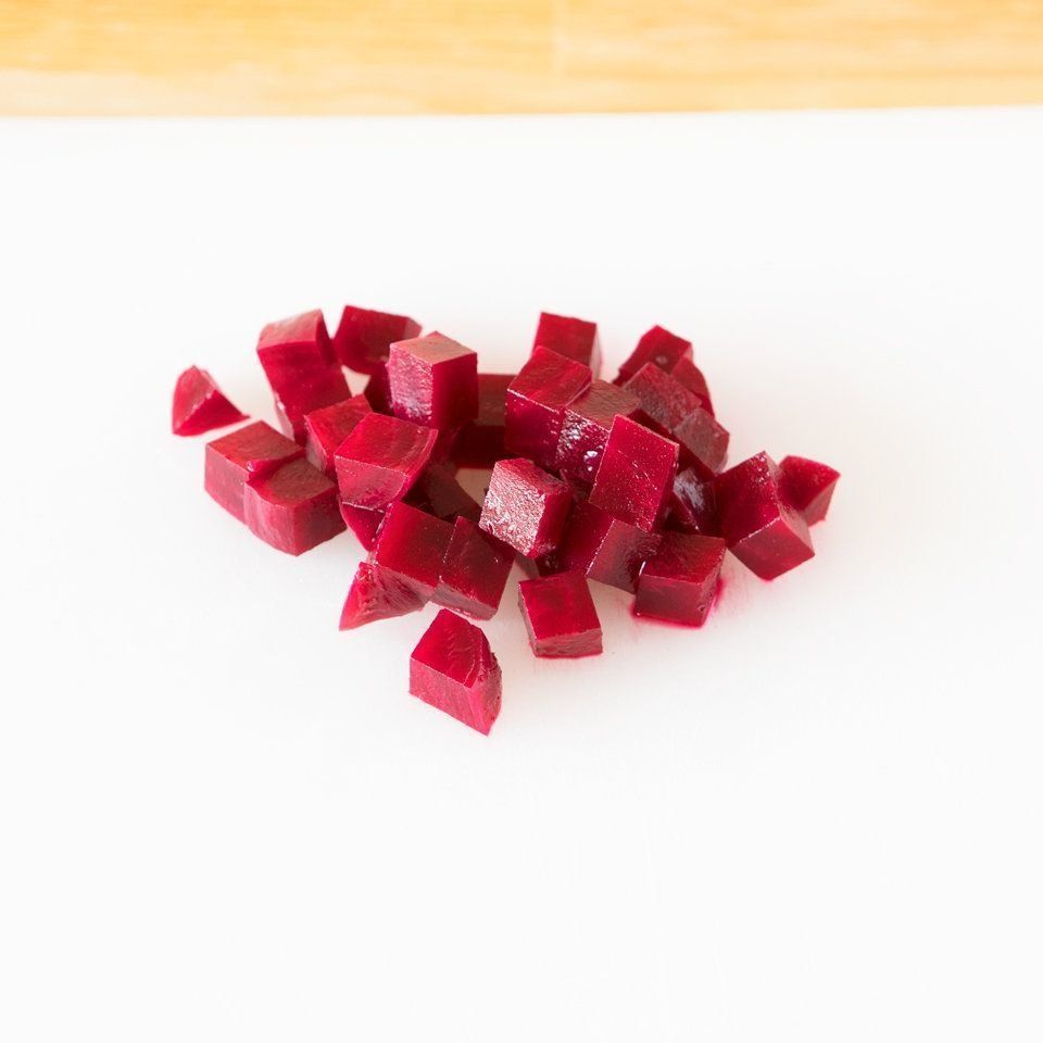 皮をむいて、1cm角に切るんですね。ゆでたビーツさえあれば、いろいろな形のサラダになっていいですね!