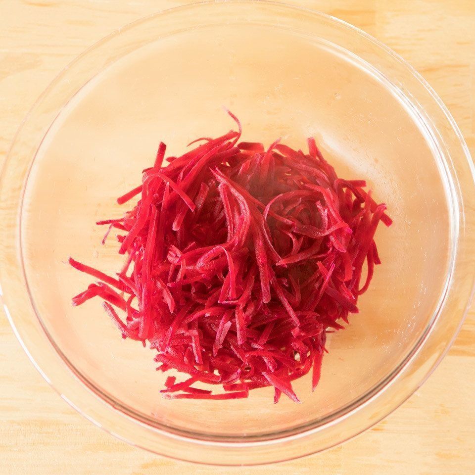 1 ビーツは包丁で皮をむき、せん切りスライサーでせん切りにする。