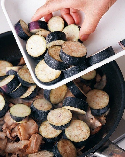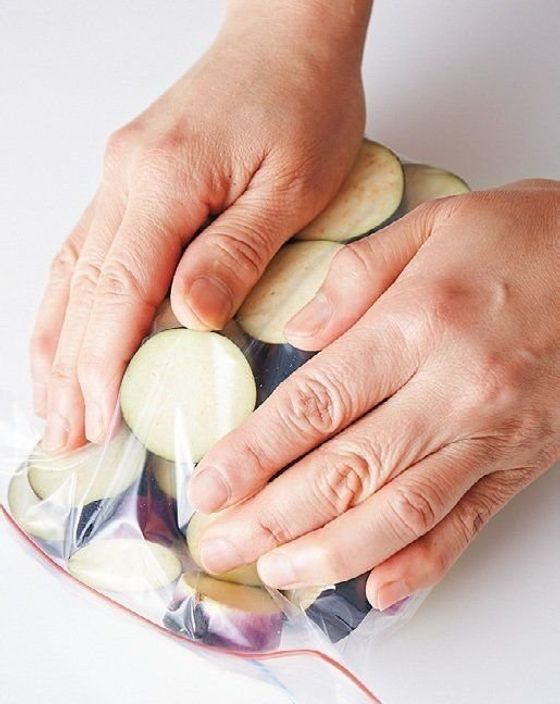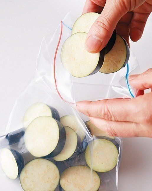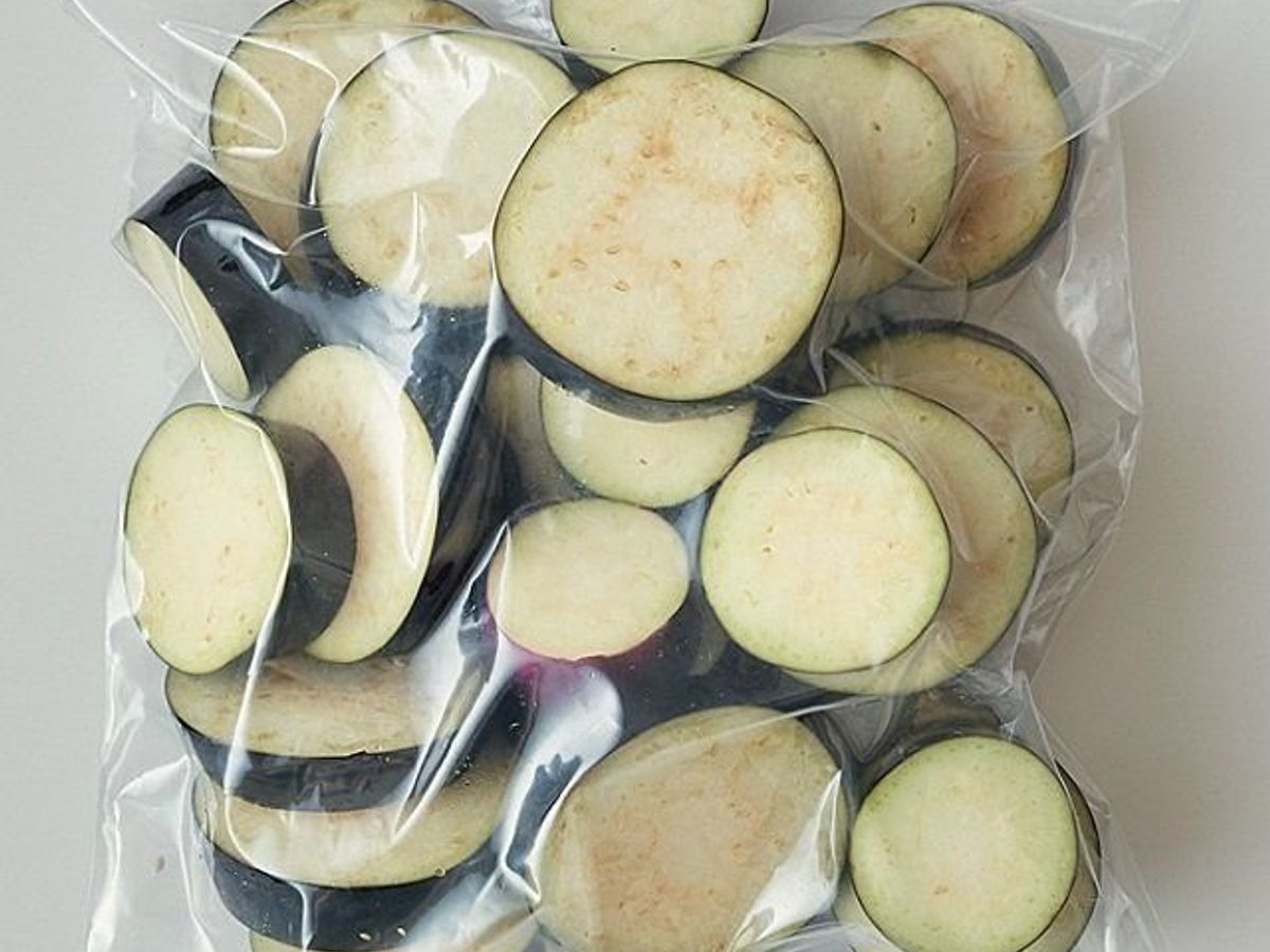 すぐにしなびてしまうなすも、生のまま冷凍保存が可能。炒めものや煮ものに使いやすいよう輪切りや乱切りにして冷凍室へ。ここでは厚さ1.2㎝の輪切りにしているが、使う料理に合わせた切り方にしてOK。 *ズッキーニも同じように冷凍可能