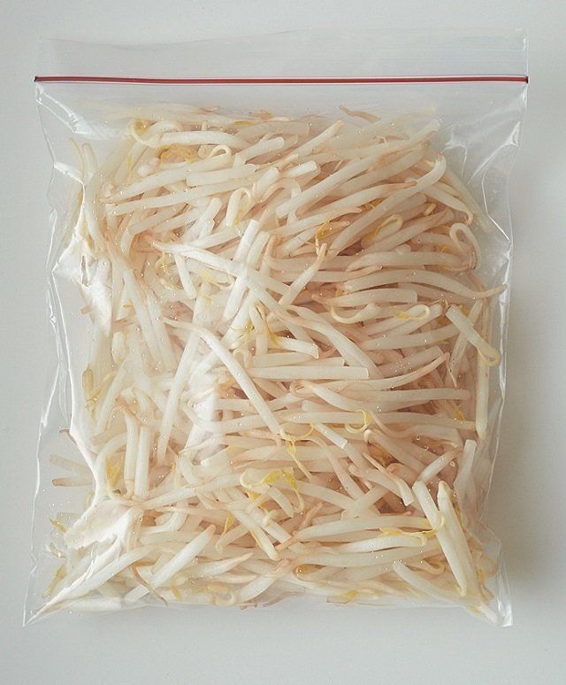 もやしはたっぷりの水で洗い、水けをよくきって(あればサラダスピナーを使う)から冷凍。余裕があるときは、ひげ根を取るとよい。時間がないときは、買ってきたまま袋を開けずに、袋ごと冷凍してもOK。