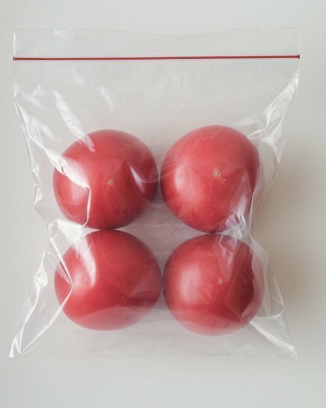 トマトは、どんどん熟していくので、洗って水けを拭いて、早めに冷凍する。大量に買ったときは、売っている袋ごと冷凍してもOK。冷凍室から出して表面が白くなったら切れる硬さになっているので、使う直前に料理に合った大きさに切る。