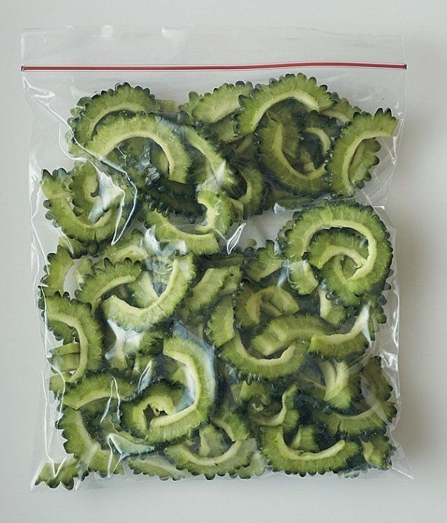 冷凍してから調理すると柔らかくなるので、炒めものにしたいときは、くずれないよう少し厚めに切る。縦半分に切ったあと、スプーンで種とわたを取り、幅3~4㎜に切る。ゆでてあえものに使いたい場合は、もっと薄く切るとよい。