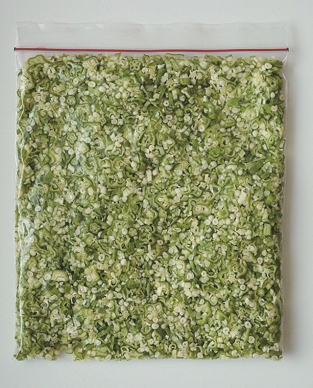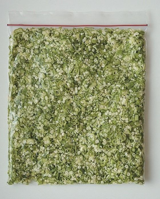 長いままや小口切りにして冷凍したものは、調理したときに繊維が残って筋っぽさが気になるので、細かくたたいて冷凍。洗って水けを拭き、へたとがくを切り落とし、薄い小口切りにして、さらに粘りが出るまで包丁でたたく。