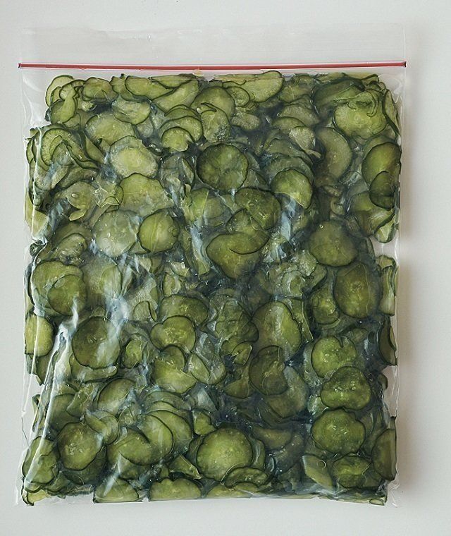 塩もみして水分を除いてから冷凍。薄い小口切りにして塩をふって混ぜ(きゅうり1本につき塩小さじ1)、20分ほどおく。きゅうりを水で洗い、水けを絞る。