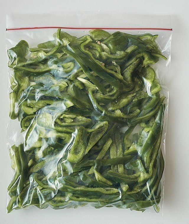 冷凍した野菜を調理すると皮の硬さが気になるので、ピーマンは、縦や横向きではなく、斜めに切って繊維を断つとよい。縦半分に切って、へたと種を取り、斜めに幅3~4㎜の細切りにする。