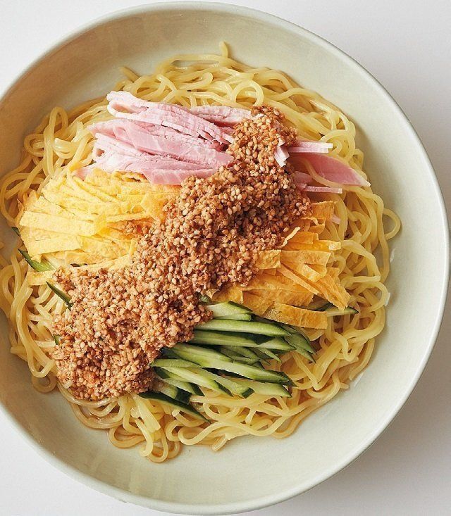 薄焼き卵2枚は自然解凍して広げ、4等分にして重ね、幅3~4㎜に切る(1人1枚分が目安)。中華麺2玉の上に、ハムやきゅうりの細切り各適量とともに盛り、たれ(白すりごま、酢各大4、しょうゆ大3、砂糖大2、水100ml、ごま油大1を混ぜる)をかける。