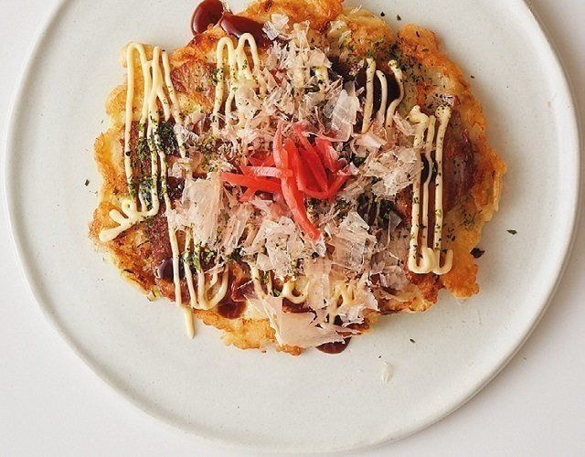 卵1個、水200ml、塩少々を泡立て器で混ぜて自然解凍した長いも120gを混ぜ、キャベツのせん切り120g、ねぎの小口切り5㎝分を混ぜて生地を作る。豚薄切り肉150gを半量ずつ直径15㎝大に並べて焼いた上に、生地を半量ずつ流して両面を焼き、お好み焼きを作る。