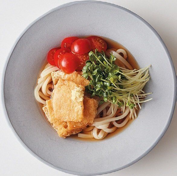 小さいフライパンにめんつゆ(ストレート)大3、砂糖大1/2を入れて煮立て、食べやすく切った油揚げ1枚を凍ったまま入れ、弱火で汁けがなくなるまで煮る。ゆでて冷水で洗って水けをきったうどん1玉にのせ、貝割れ菜、プチトマト、おろししょうが各適量を添え、めんつゆ(かけつゆ用)100mlをかける。