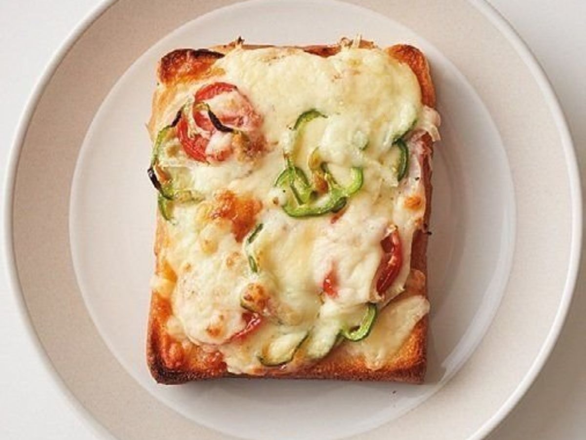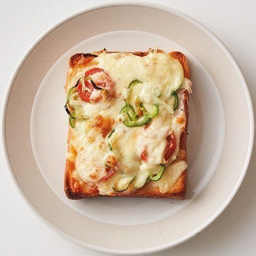 食パンにバターとケチャップを塗り、好みの具と凍ったままのチーズをのせて焼く。ハム、ピーマンの輪切りと玉ねぎの薄切りを混ぜて塩、こしょうをふったもの、プチトマトの輪切りをのせれば完成。