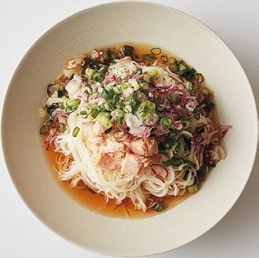 ゆでて洗って水けをきったそうめんに、ほぐしたツナ、凍ったままの薬味野菜ミックスをのせ、めんつゆ(かけつゆ用)をかけて。氷で冷やさなくてもひんやり。