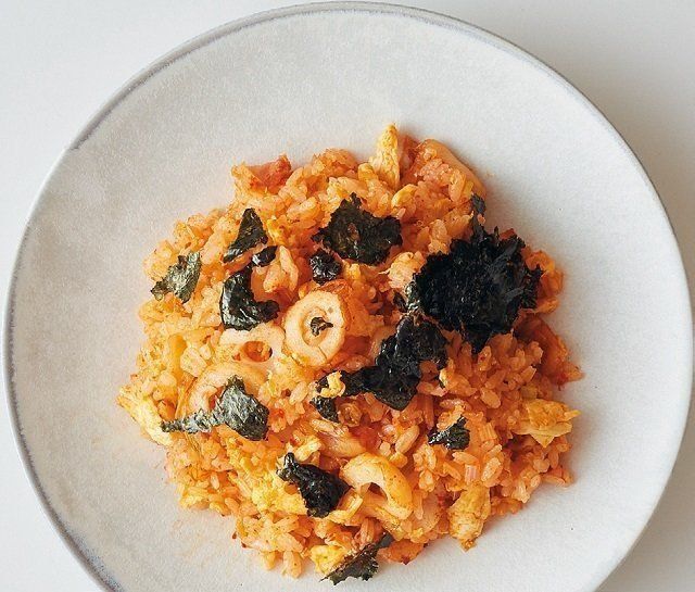 キムチ100gは凍ったまま1.5㎝角に切り、自然解凍する。サラダ油大1/2で溶き卵2個分を炒めていり卵を作って取り出す。サラダ油大2でねぎの小口切り6㎝分、ちくわの輪切り1本分を炒め、温かいご飯400gを加え、いり卵を戻して炒め合わせ、キムチを加えて炒め、酒大1をふって炒める。もみのり1/2枚分を散らす。