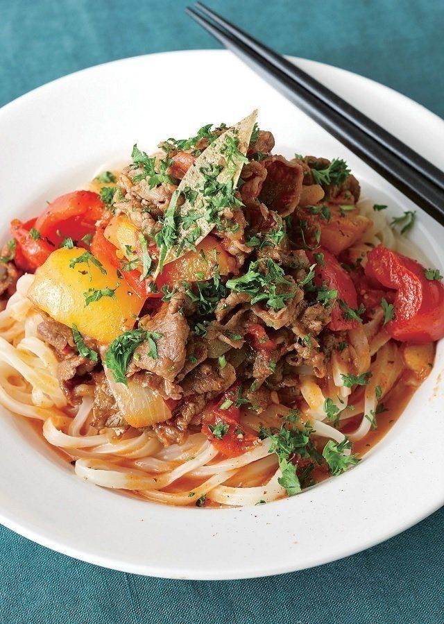 牛肉とトマトのカレー炒めのっけうどん