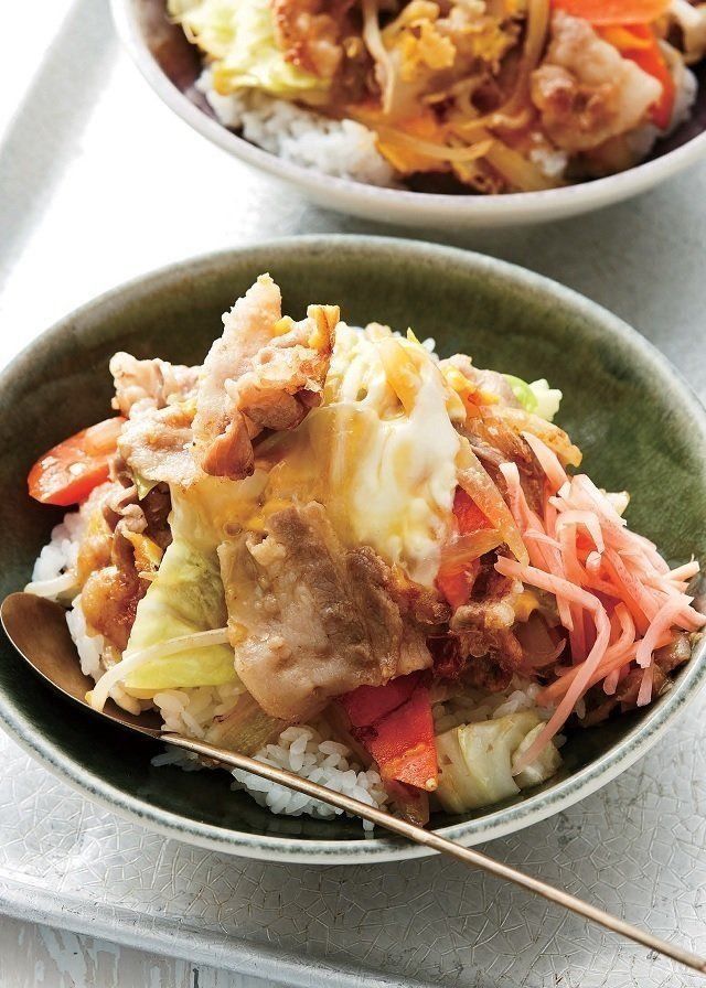 肉野菜炒めの卵とじをかけた栄養満点のご飯。肉野菜炒めの仕上げに溶き卵を回し入れ、たんぱく質を強化!