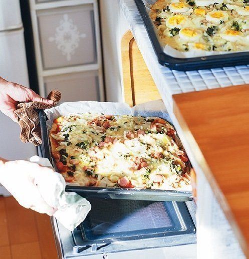 土曜日に残っている食材は、何でもピザ生地にのせて焼けばOK!「簡単だし、食材はムダなし。パーティー気分も盛り上がります♪」