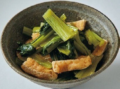 小松菜1袋(200g)は食べやすい長さに切る。油揚げ1枚は幅1㎝ に切る。耐熱ボウルに入れて、めんつゆ小さじ4、砂糖小さじ2、水100mlを加え、ふんわりとラップを掛けて電子レンジで7分加熱する。よく混ぜてさます。
