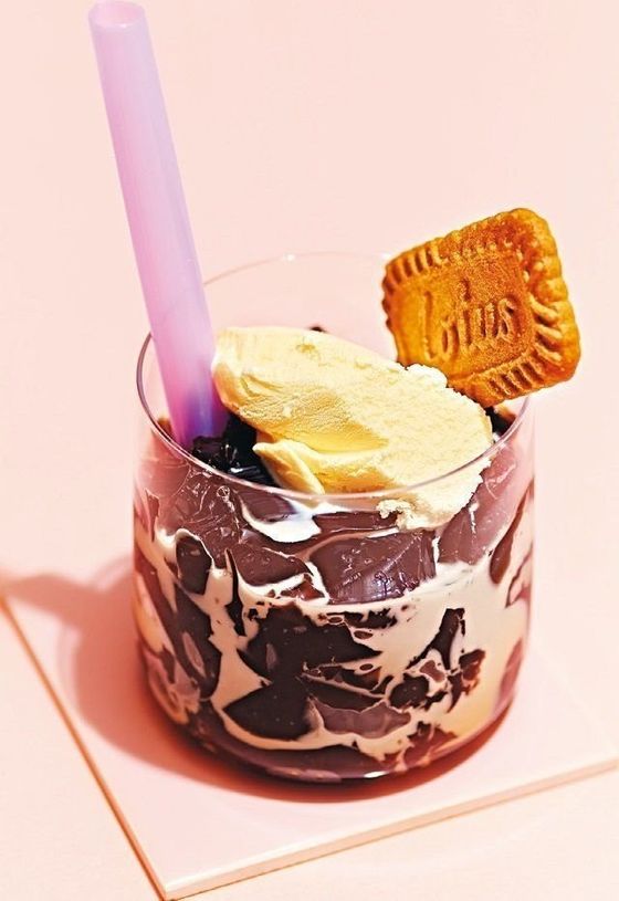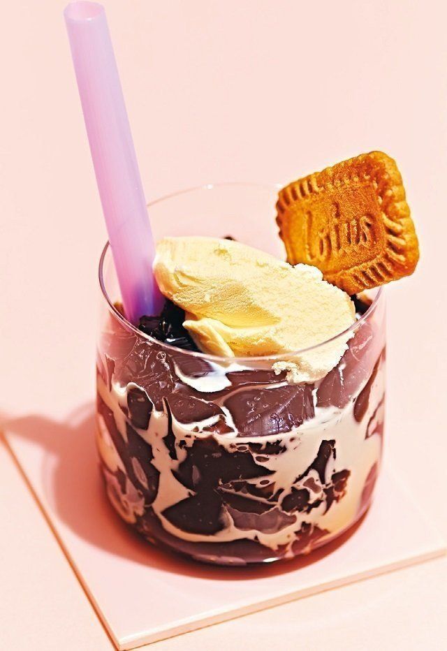 (3)2をスプーンでくずしてグラスに入れ、牛乳を注ぐ。バニラアイス、ビスケットをのせる。