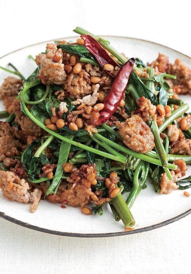 赤唐辛子、納豆、Aを加えてからめる。空芯菜の茎を加えて混ぜ、なじんだら、葉の部分を