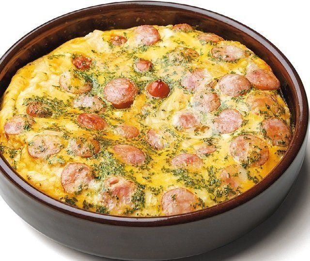 ボウルに卵3個を溶き、幅1㎝の輪切りにしたソーセージ5本分(100g)、ピザ用チーズ大3(30g)、ドライパセリ小1を混ぜ、耐熱容器に流す。予熱したオーブントースターで12~13分焼く(途中、焦げそうならアルミホイルをかぶせる)。
