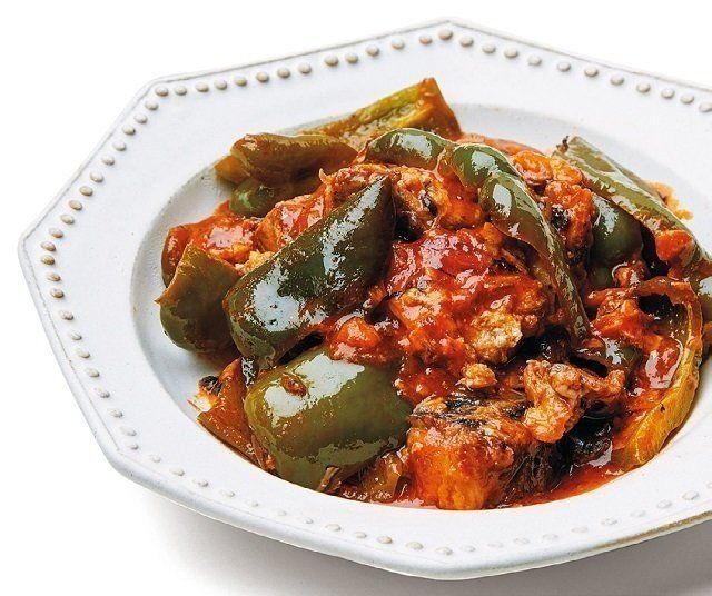 直径20㎝の耐熱ボウルに、ケチャップ大3、しょうゆ小、こしょう少々、オリーブ油小2を入れて混ぜ、汁けをきって粗くほぐしたさば水煮缶1缶(約190g)、乱切りにしたピーマン4個分(120g)を加えてざっと混ぜる。ふんわりとラップを掛け、電子レンジで6分加熱し、混ぜる。