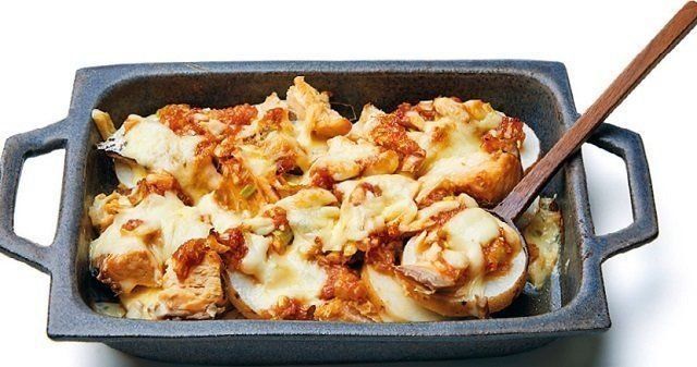 耐熱容器に手でひげを取り、幅5㎜の輪切りにした長いも150gを広げ、汁けをきった鮭水煮缶(小)1缶(90g)を粗くほぐしてのせる。ねぎのみじん切り大4、みそ大2、砂糖大1、削り節(2.5g入り)1/2袋を混ぜてかけ、ピザ用チーズ大4(40g)をのせる。予熱したオーブントースターで焼き色がつくまで10分ほど焼く(途中、焦げそうならアルミホイルをかぶせる)。