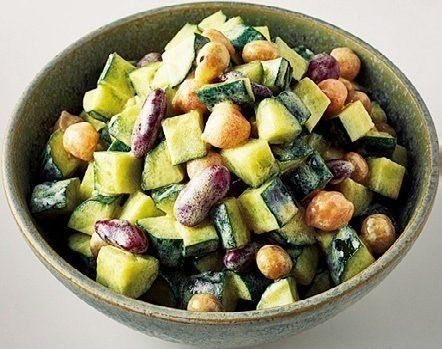 きゅうり3本は縦4等分に切ってから、幅1.5㎝に切る。ミックスビーンズ2 パック(100g)と合わせ、トルコ風ヨーグルトだれであえる。
