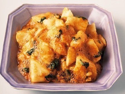 長いも350gは皮をむいてポリ袋に入れ、めん棒などでたたき一口大に割る。青じそじょうゆだれであえる。