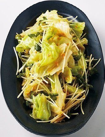 キャベツ6枚は一口大にちぎってさっとゆでる。貝割れ菜1/2パックは根元を落として半分に切る。合わせて、しょうがみそだれであえる。