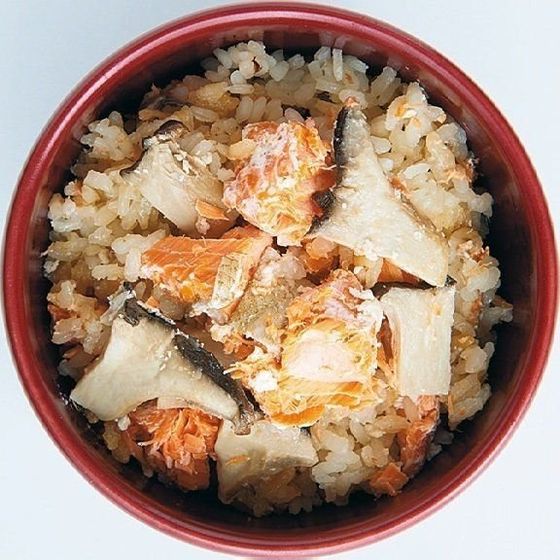 *鮭は、炊き上がったら骨と皮をはずし、ほぐして混ぜる。