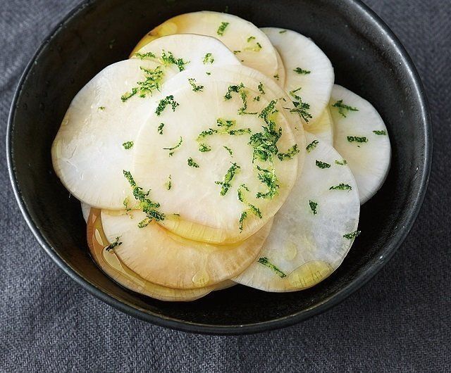 かぶは皮をむいて薄い輪切りにする。すだちは半分に切る。器にかぶを盛って、しょうゆ、オリーブ油をかけ、すだちを絞る。すだちの皮をすりおろして散らす。