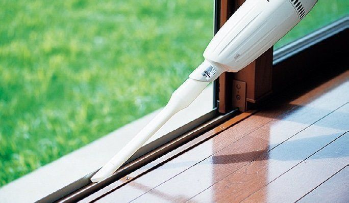 サッシはぬらさずに掃除を進める。まずは掃除機の先端にすき間用ノズルを取りつけ、サッシの砂ぼこりをざっと吸い取る。