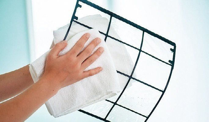 エアコンのプラグを抜いてから作業をする。フィルターの表面のほこりを掃除機で吸い取ってから、フィルターをはずす。
