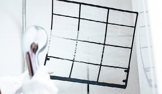 フィルターは裏側からシャワーの水を当てると、汚れがよく落ちる。こびりついている場合は、表側から古歯ブラシでこすって落とす。