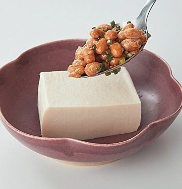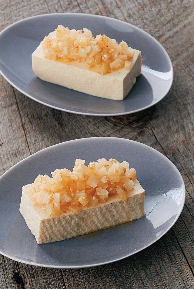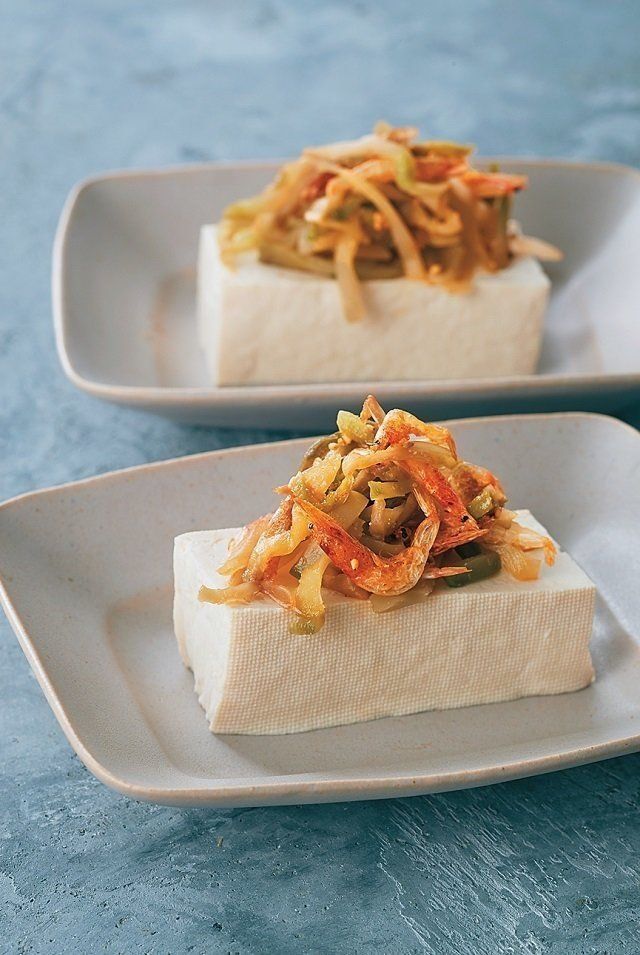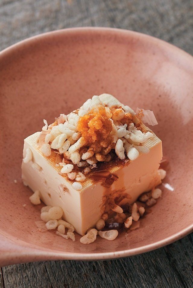 好みの豆腐にトッピングをのせる。豆腐は、電子レンジで温めてもおいしい。