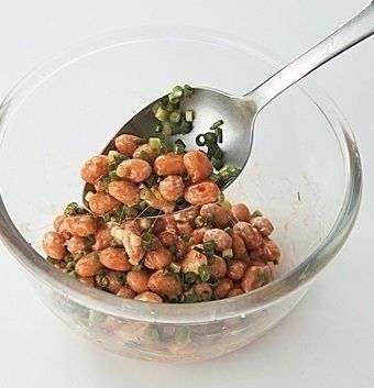 納豆と調味料など、のせたい材料を混ぜ合わせる。