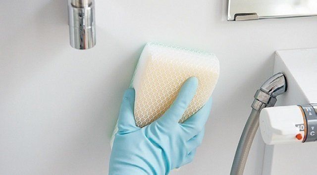 浴室用スポンジにAをつけて皮脂汚れを落としていく。汚れが取れたと感じたらここで終了でOK。T字ワイパーをかけてしっかり水分をきる。