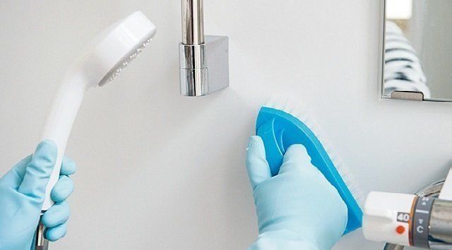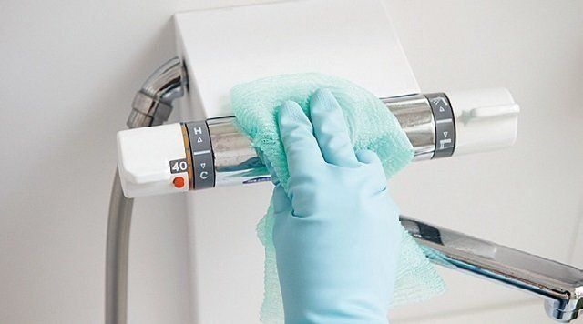 シャワーでお湯をかけながら蛇口を古歯ブラシでこする。そのあとで蛇口とシャワーヘッドにBをかけてナイロンタオルで磨き、お湯でよく流す。
