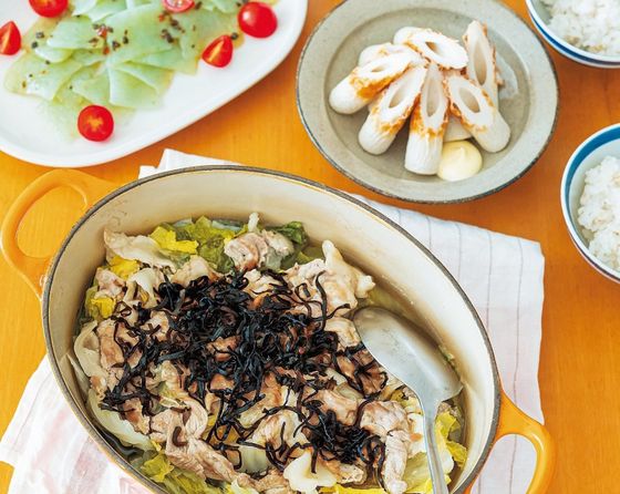 週半ばの疲れが出る水曜日はラクさ優先。鍋を火にかけたら、あとはほったらかしでできる物に。厚手の鍋にざく切りの白菜をすき間なく詰め、豚こまを散らして塩昆布をのせて蒸し煮に。「夫の帰宅が遅いときでも、鍋ごと火にかけて温めればいいので便利です」