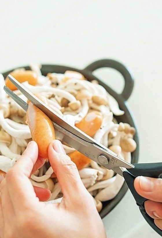 ウインナーはしめじの上でキッチンばさみでカット。塩とオリーブ油をかけてオーブントースターで焼くだけ。キャベツのゆかり®あえは手でちぎり、この日は包丁もまな板も使いません。