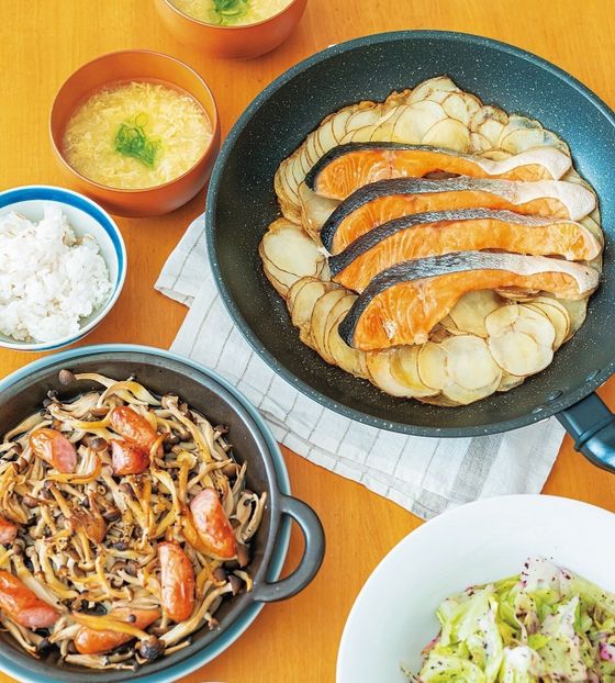 週末に買い物に行くことが多いので魚は早めに消費。火曜日がゴミ収集日で、生ゴミを翌日に出せるのも◎。メインはフライパンにスライサーで薄切りにしたじゃがいもを敷き詰め、塩鮭をのせてふたをして加熱。鮭の塩けだけで味つけいらずです。フライパンで魚を焼くことも。