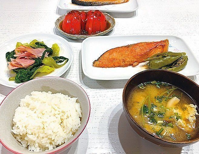 焼き鮭&しし唐、スライストマト、青梗菜とベーコンのコンソメ煮、みそ汁