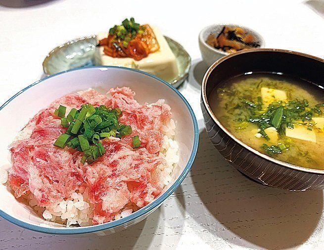 ねぎとろ丼、キムチ冷ややっこ、作り置きひじき煮、みそ汁