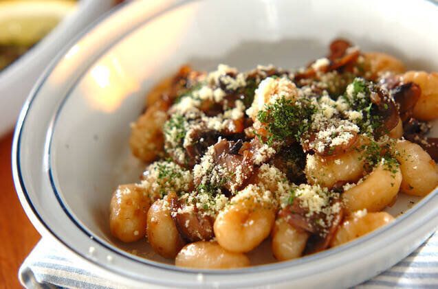 洋食のメインにぴったりの、キノコソースのニョッキのレシピです。マッシュルームやシイタケなどが入った「ソース」で、きのこの旨味を堪能できそう。粉チーズやドライパセリをふっていただきます!